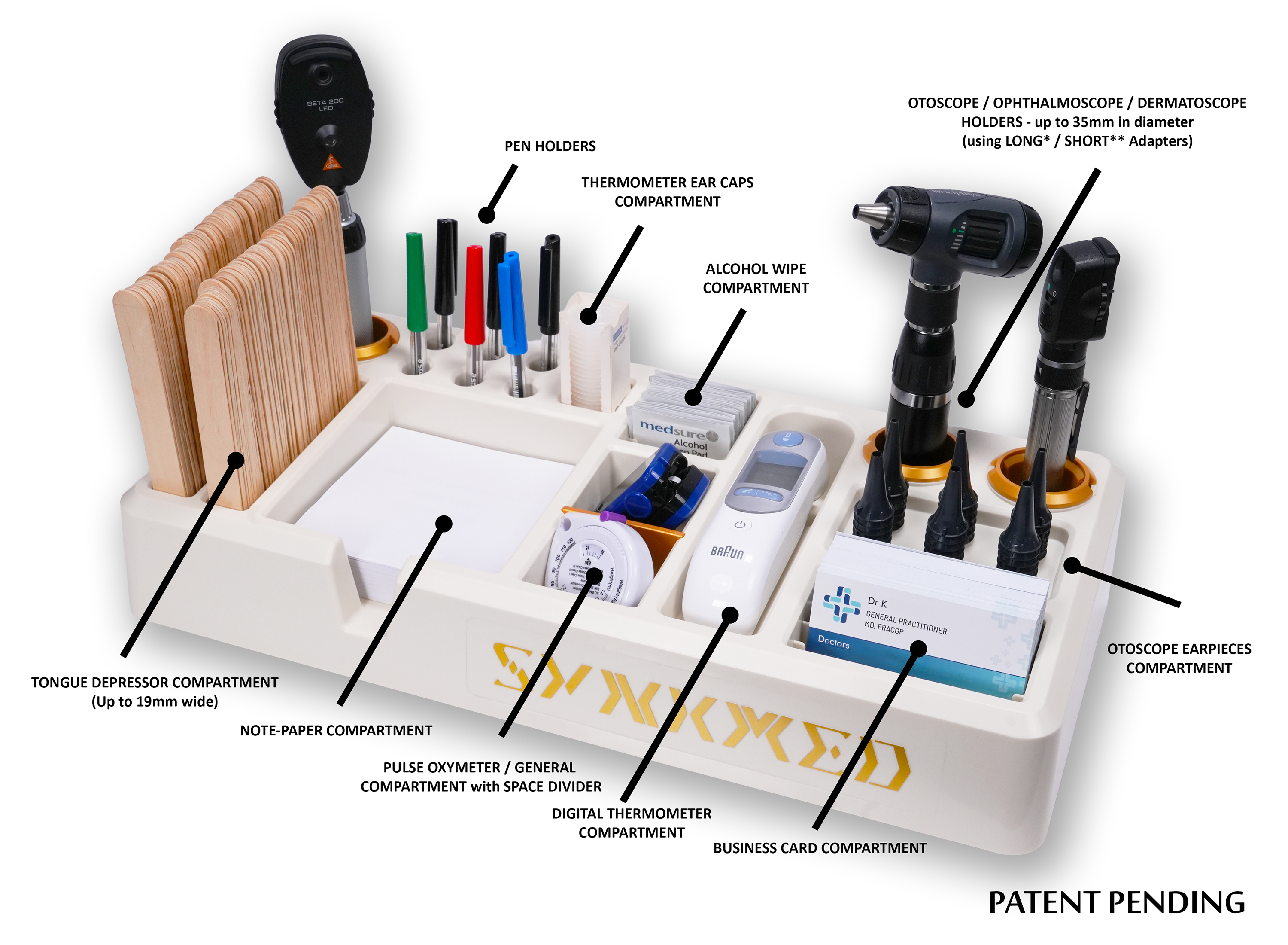 DDORG II features a thoughtfully designed set of compartments tailored to meet the specific needs of healthcare professionals. It includes three cylindrical compartments perfect for storing handheld examination devices like otoscopes, ophthalmoscopes, and dermatoscopes, with an adaptable system to accommodate various device sizes. Additionally, the organizer offers spacious sections for medical tools, supplies, and personal items, ensuring everything has its place. The modular design allows for easy customization, enabling you to rearrange compartments based on your workflow and preferences, keeping your workspace organized and efficient (patent pending).
